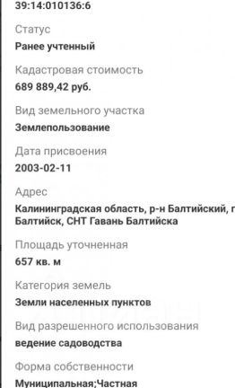 Продаётся участок площадью 6,57 сотки в СНТ Гавань Балтийска, посёлок Мечниково (Балтийск, Калининградская область). Кадастровый номер: 39:14:010136:6.
