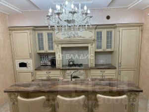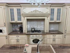 Кухонное пространство, изготовленное из дуба, включает в себя остров. Вся встроенная кухонная техника представлена микроволновой печью с грилем, плитой, духовым шкафом, посудомоечной и стиральной машинами с функцией сушки.