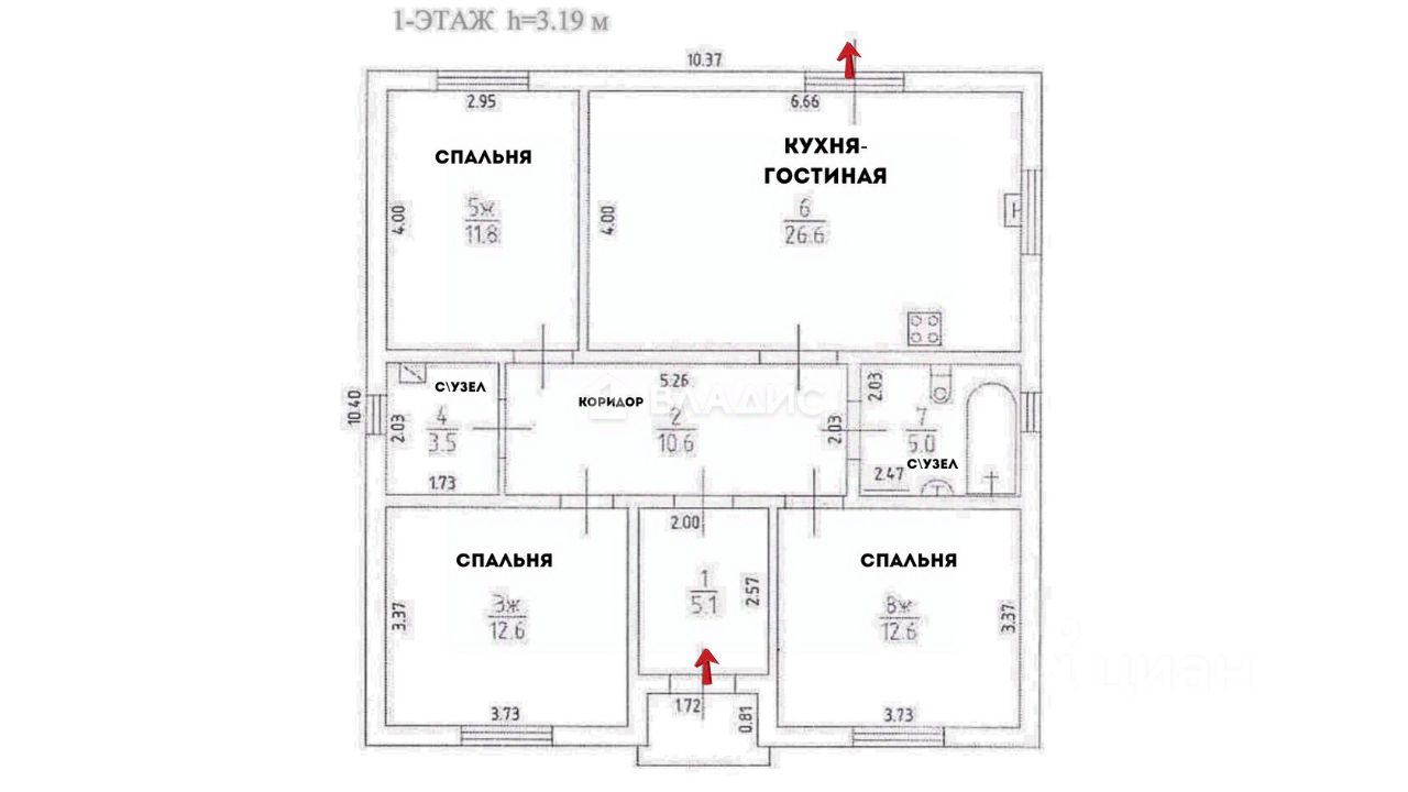 - 3 комнаты: 12.6 + 12.6 + 11.8 м² ;