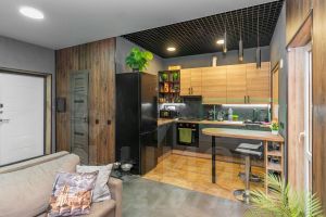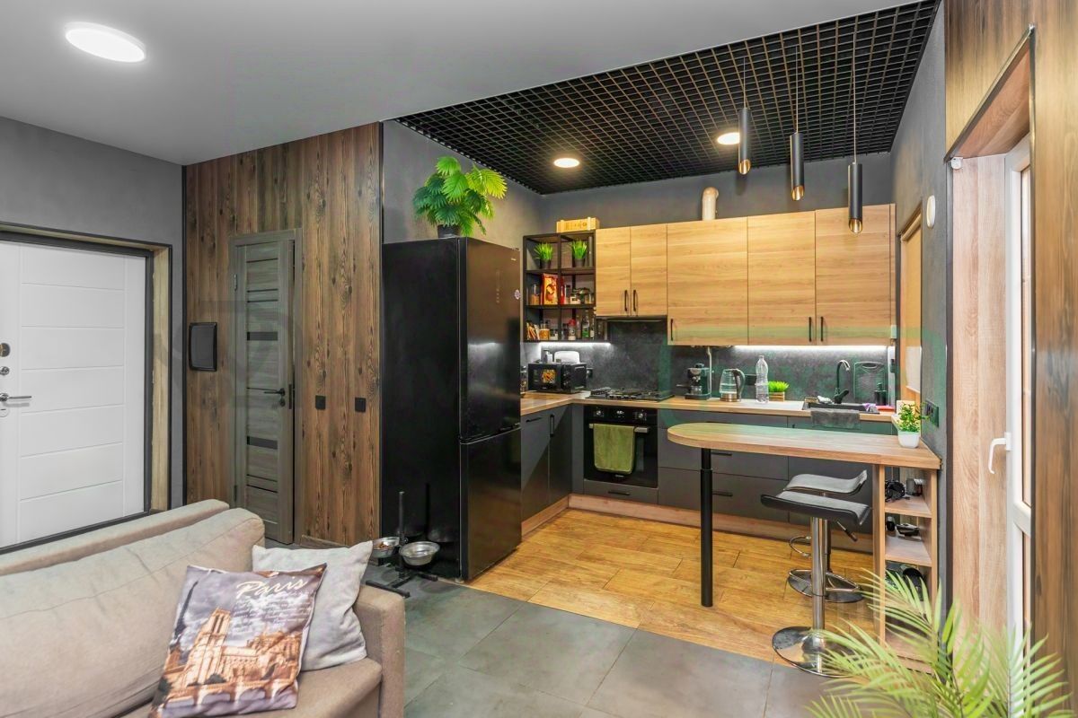 Прoсторная функциональная кухня-гостиная (25 м2!) с панорамным окном и выходом на террасу (20 м2);