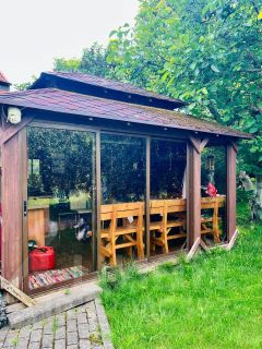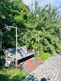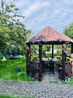 На участке есть все для отдыха: мангальная зона (казан, мангал), батут, костровая чаша, садовая мебель из ротанга, качель.