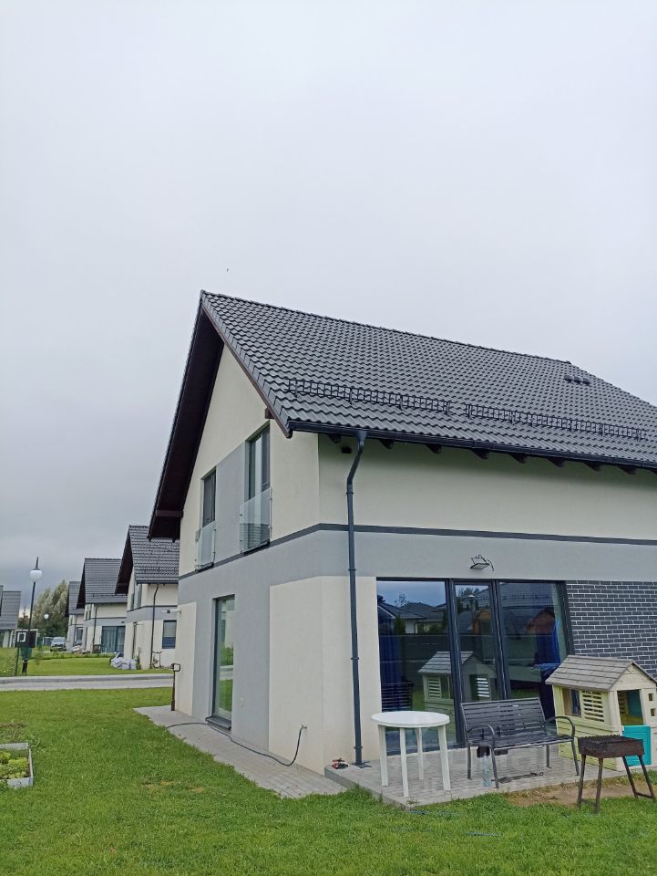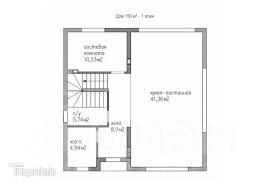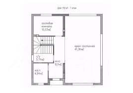 На первом этаже: комната для гостей, ванная комната и хоз. помещение, просторная светлая кухня-гостиная 41 кв м с большими панорамными окнами. Здесь же выход на террасу.