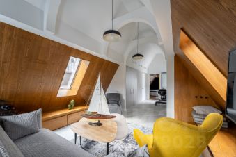 дополнительную спальню), гостиная зона в морской тематике, а также терраса на крыше с