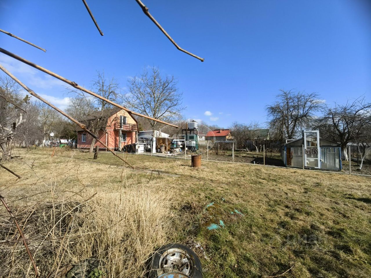 - Имеется домик с печкой, сарай, теплица и ручей. Домик пригоден для временного проживания во время строительства частного дома (санузел на улице).