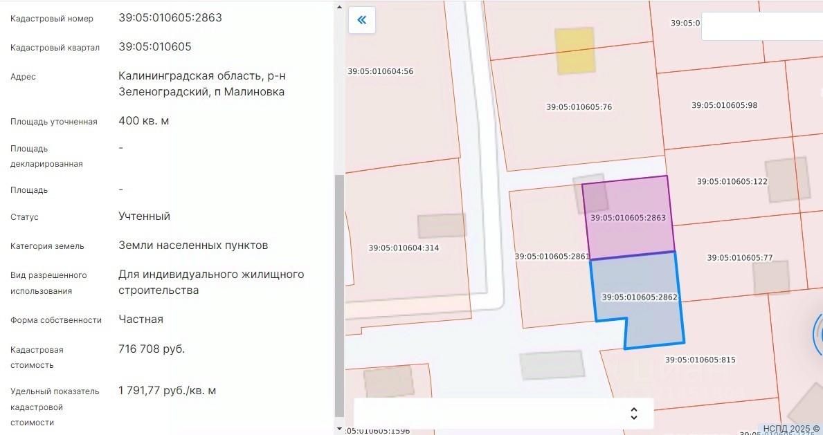 Продаётся земельный участок под индивидуальное жилищное строительство (ИЖС), кадастровый номер 39:05:010605:2863.