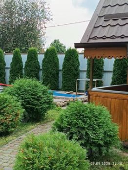 Участок (14,5 соток) окружён надёжным забором. Здесь есть беседка с зоной барбекю и баня с уличным бассейном.