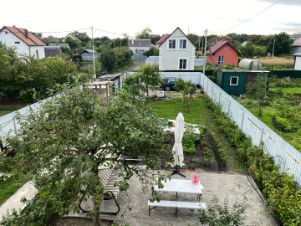 Площадь участка 5,5 соток с плодовыми деревьями и кустарниками, зона отдыха, места для парковки машин. Забор по периметру участка стоит на фундаменте.