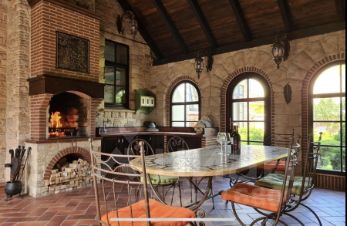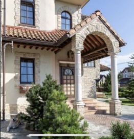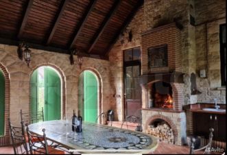 На территории- ландшафтный дизайн. Деревья- хвойные ( кедры, сосны). И, плодовые( яблони, груши).