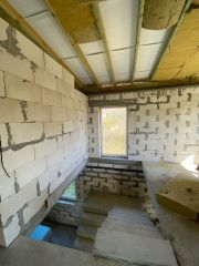 Стены: блок 300мм+ пенополистерол 100мм, сетка армирующая и клей,