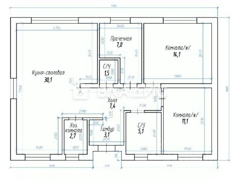 - общая площадь - 87 кв.м., тамбур - 3,1 кв.м., холл - 7,4 кв.м., кухня-гостиная - 30,1 кв.м. с застеклённым в пол выходом на открытую террасу, 2 спальни - 14,1+11,1 кв.м., 2 санузла - 5,1+1,5 кв.м., прачечная - 7 кв.м., хоз. помещение - 2,7 кв.м.