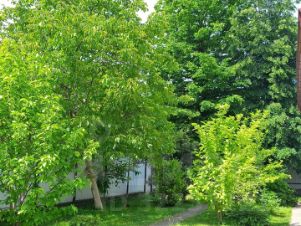 В саду растут плодовые деревья многолетние декоративные растения и кустарники: персик, яблони, груши, слива, вишня, черешня, виноград, айва, рододендрон, магнолии, цветы.