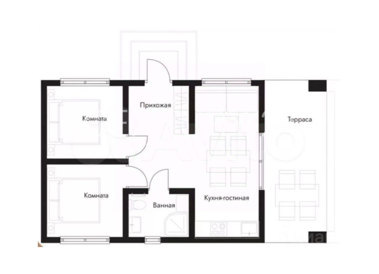 Дом вместил в себя 2 изолированные комнаты и кухонную зону со вторым светом, большими панорамными окнами и выходом на крытую террасу.