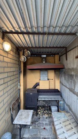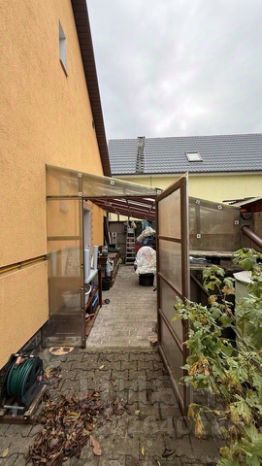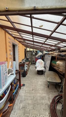 К дому пристроен закрытый навес с верстаком для хобби.