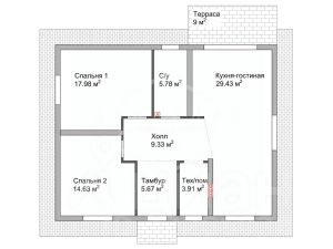 Планировка дома максимально функциональна и продумана до мелочей, что обеспечивает комфортное проживание: кухня-гостиная 32.57 кв.м с выходом на террасу 10.2 кв.м, спальни 17.98 и 14.63 кв.м, ванная комната, просторный холл и техническое помещение.