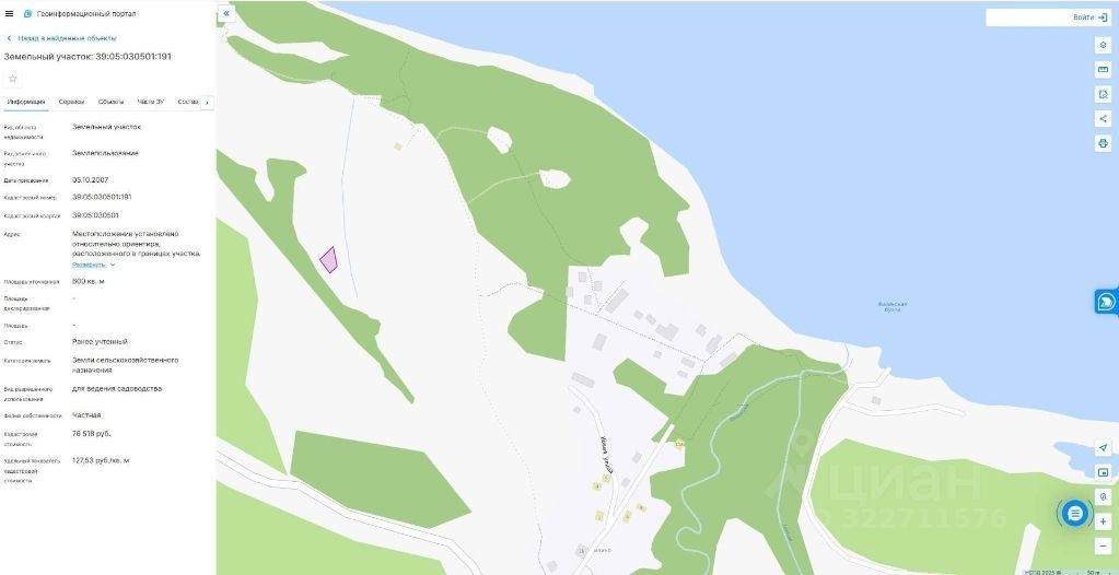 Земельный участок площадью 600 кв.м. с кадастровым (условным) номером: 39:05:030501:191; категория земель: земли сельскохозяйственного назначения, вид разрешенного использования: для ведения садоводства, расположенный по адресу: Калининградская область, Зеленоградский МО, пос. Филино, территория СНТ Рощино-Калининград, ул. Радужная, земельный участок 84