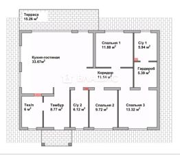 - общая площадь - 112 кв.м., тамбур - 8,77 кв.м., коридор - 11,14 кв.м., кухня-гостиная - 34 кв.м. с застеклённым в пол выходом на открытую террасу - 15,26 кв.м., 3 спальни - 13,32+11,88+9,72 кв.м., 2 санузла - 6,12+5,94 кв.м., гардеробная - 5,39 кв.м., техническое помещение - 6 кв.м.