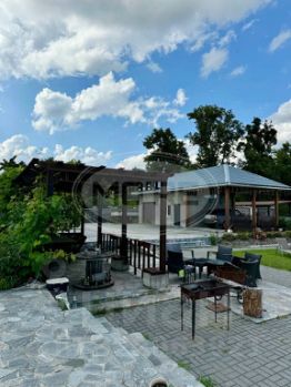 На территории дома расположена современная баня на дровах с ротанговой мебелью, крытой беседкой и помещением для хозяйственных нужд. Также имеется открытая беседка с мебелью и шезлонгами, красивый ландшафтный дизайн с многочисленными посадками (розы, рододендроны, лилии, ирисы, груши, виноград, смородина и многое другое).