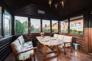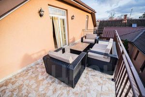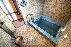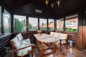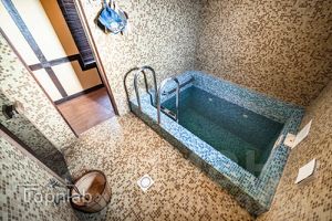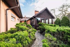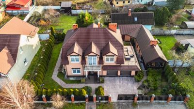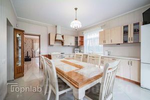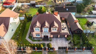 В доме - интернет, установлена сигнализация. Есть гараж на две машины с выходом из дома. Это практично и удобно. На земельном участке площадью 6 соток расположен банный комплекс с бассейном и крытой беседкой. Просторная комната с комфортной мебелью и камином, где можно расслабиться после парной или купания. Небольшой санузел. Хозблок с дровником.