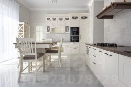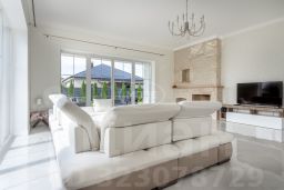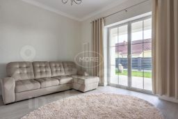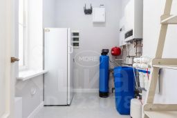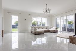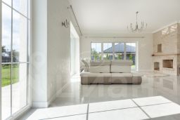 На первом есть этаже подогрев полов. Высота потолков 3,5 метра. Из просторной гостинной, площадью 49 м2 выход в кухню 25,5 м2 и на открытую террасу в сад. В доме еще есть две отдельных комнаты, два санузла. Межкомнатные двери деревянные из ясеня.