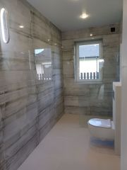 - фасад утеплен пенополистеролом 10 см, нанесена силиконовая штукатурка, входная зона отдекорирована износостойкой мозаичной штукатуркой;