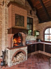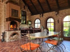 Зона барбекю с камином и полноценной кухней( итальянская кованная мебель, есть стол с итальянской мраморной мозаикой).