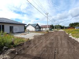 Подъезд к участку: хорошая грунтовая дорога, далее асфальтированная дорога с оборудованным тротуаром и велодорожкой.