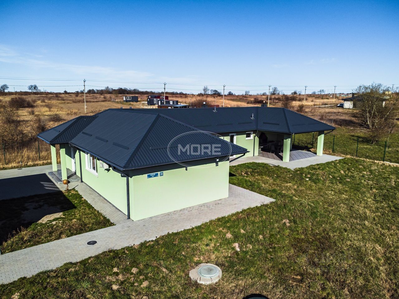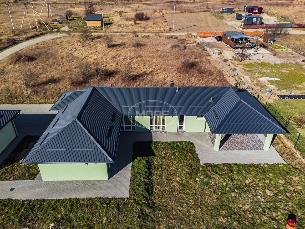 Парковка и тропинки вокруг дома выполнены из тротуарной плитки