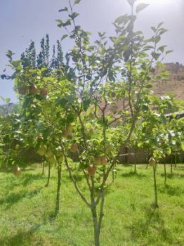 На участке высажено много разных плодовых деревьев и ягодных кустов.