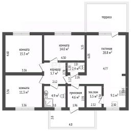 - Крытая терраса размером 22 квадратных метра предлагает идеальное место для отдыха на свежем воздухе даже в дождливую погоду.