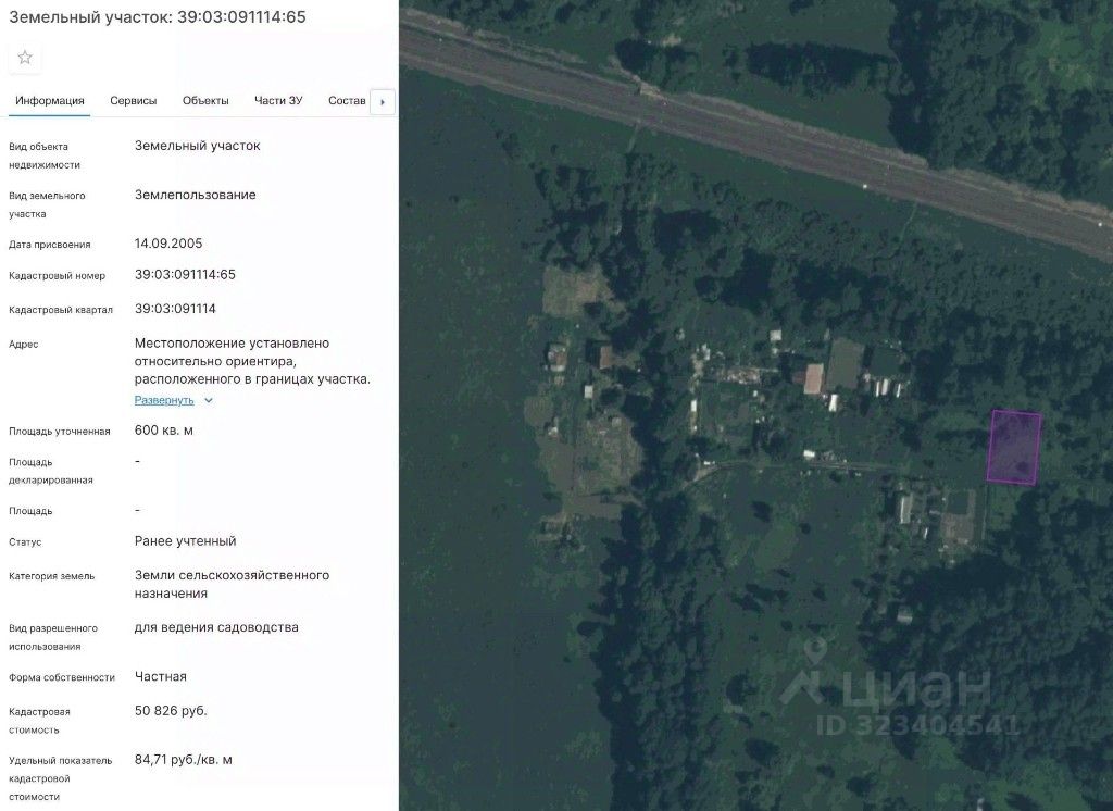 Земельный участок, общей площадью 600 кв. м, категория земель: земли сельскохозяйственного назначения, виды разрешенного использования: для ведения садоводства, кадастровый номер: 39:03:091114:65, местоположение: Калининградская область, р-н Гурьевский, с/т Вишневое-2, уч. 20.
