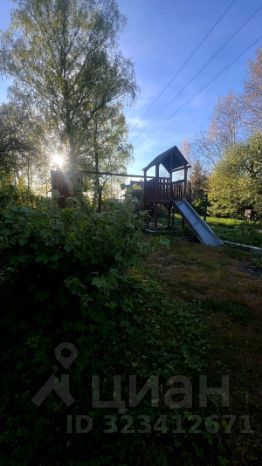 Огороженая детская площадка с домиком. Цветник, небольшая теплица, грядки.