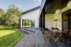 Современный дом площадью 340 м² расположен на участке 24 сотки, полностью скрытом от дороги взрослыми деревьями.
