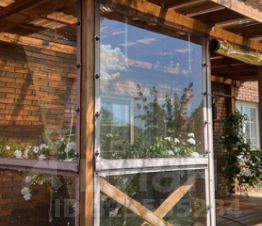 Из гостиной выход во двор через раздвижные панорамные окна-двери на оборудованную террасу из лиственницы, установлены стол и 6 стульев из ротанга, повсюду зелень и цветы.