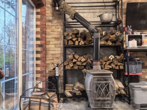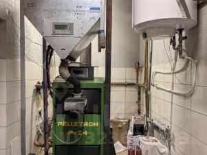 - отопление твердотопливное (на пилетах), также есть чугунная печь