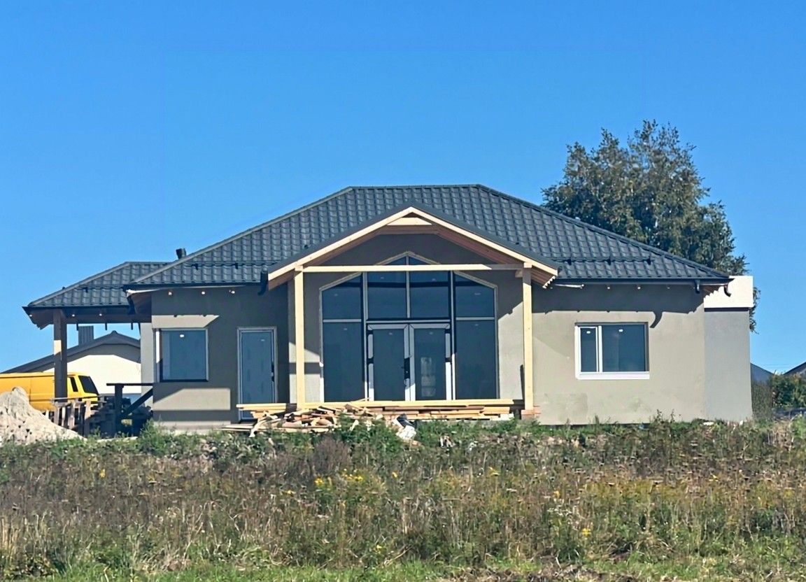 - Архитектурные особенности: фундамент выполнен в виде монолитной плиты, стены из пеноблока толщиной 300 мм, крыша покрыта металлической матовой черепицей, придающей дому стильный внешний облик.