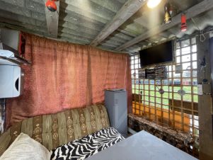 Небольшая веранда, кухня с выходами в две комнаты, санузел.