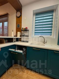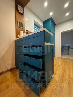 Кухня цвета бирюзового неба с множеством ящиков и супер техникой.