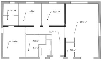 В доме очень удачная планировка для большой семьи. Расположение помещений даёт возможность с комфортом разместить от трех домочадцев.
