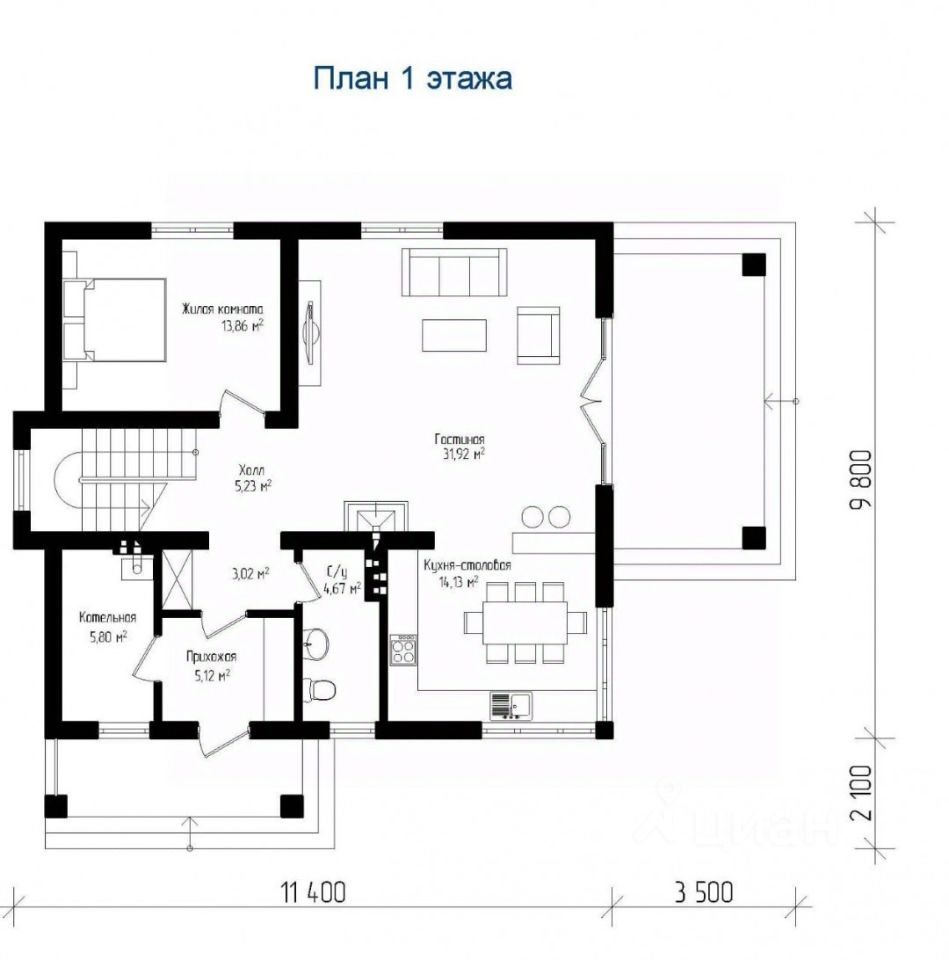 1 этаж: просторная гостиная (31, 92 кв.м!) с панорамными окнами и выходом на большую террасу, кухня столовая (14,3 кв.м), гостевая комната (13,86 кв.м.), гостевой санузел (4,67 кв.м), котельная-хозблок (5,80 кв.м)