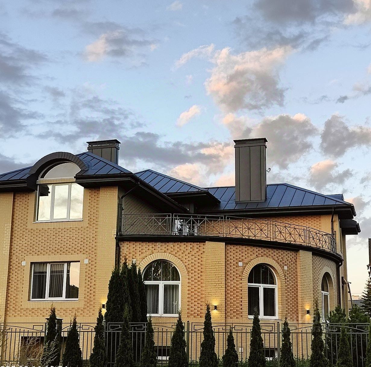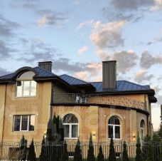 Дом, построен из газобетонного блока, фасады выложены декоративным клинкером, украшением являются высокие арочные окна.