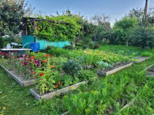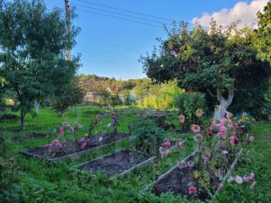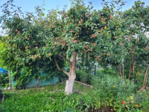 Участок отличается плодородной почвой и готовым садом с взрослыми плодовыми деревьями, включая яблони различных сортов, грушу, сливу и персик, а также ягодными кустарниками — виноградом, ежевикой, малиной, смородиной и крыжовником. Цветочные клумбы и подготовленные грядки экономят время и силы для нового владельца.