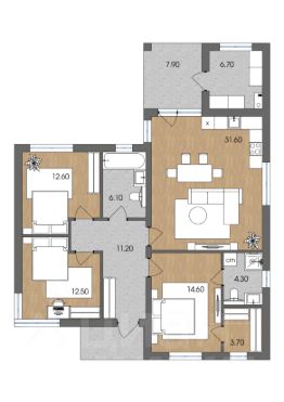 Умная планировка: Просторная кухня-гостиная станет сердцем дома, где собирается вся семья. Три ИЗОЛИРОВАННЫЕ спальни гарантируют личное пространство для каждого, а отдельная гардеробная наведет идеальный порядок.