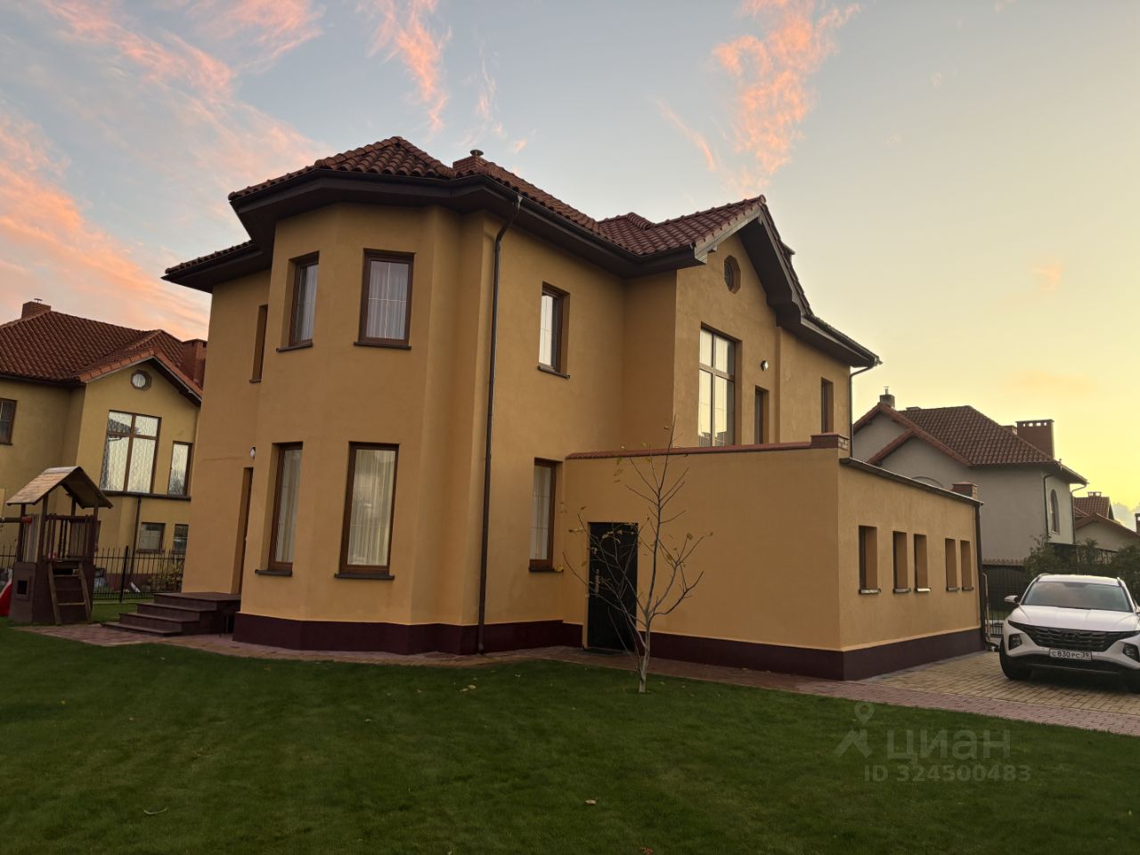 Придомовая территория полностью огорожена. Выполнен ландшафтный дизайн: разбиты газоны, установлена детская площадка, высажены плодовые, вечнозеленые деревья и кустарники.