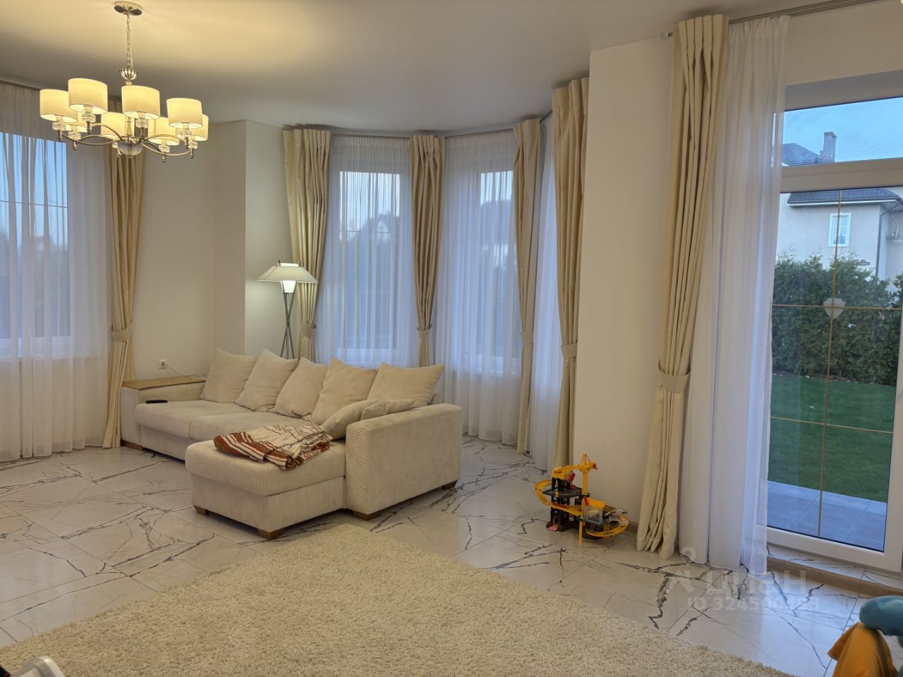 Выход из гостиной на террасу . Имеется просторный гараж.