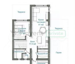 - 1 этаж: просторная кухня-столовая-гостиная с выходом на террасу, санузел, кладовая-прачечная-бойлерная, гардеробная, отдельный кабинет.