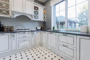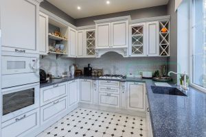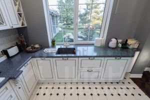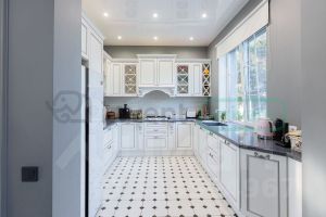 дорогая кухня со столешницей из китайского камня, цельная с раковиной.