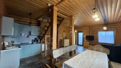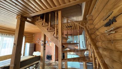 На первом этаже: большая кухня столовая для гостей, с зоной отдыха, двумя санузлами, душевой и русской баней на дровах.