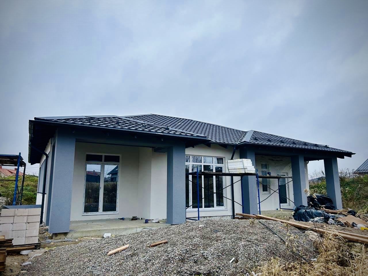 Фасад дома выполнен из полистерола 100мм, покрыт силиконовой штукатуркой типа барашек.