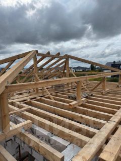 Кровля вальмовая с покрытием из металлочерепицы, карнизные свесы зашиты вагонкой. Выполнено перекрестное утепление минеральной ватой 200мм.