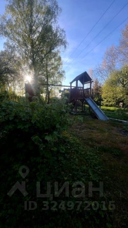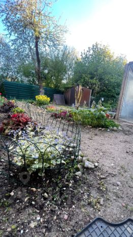 Огороженая детская площадка с домиком. Цветник, небольшая теплица, грядки.